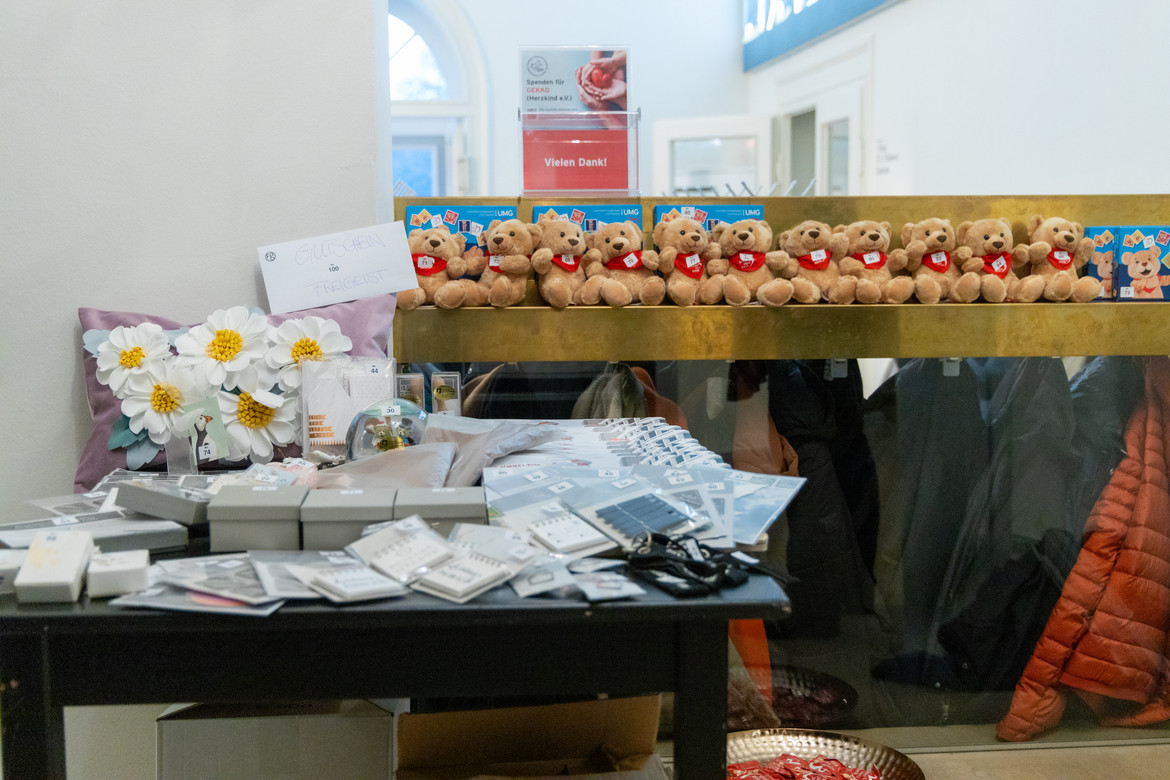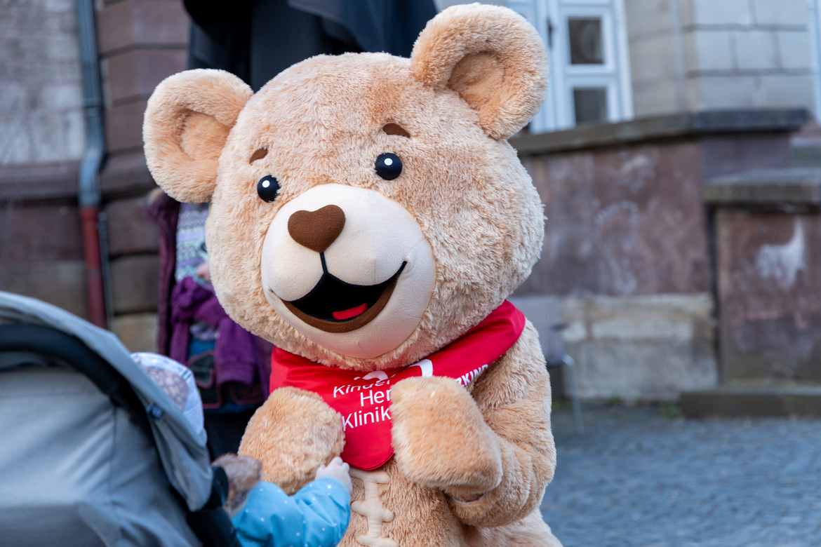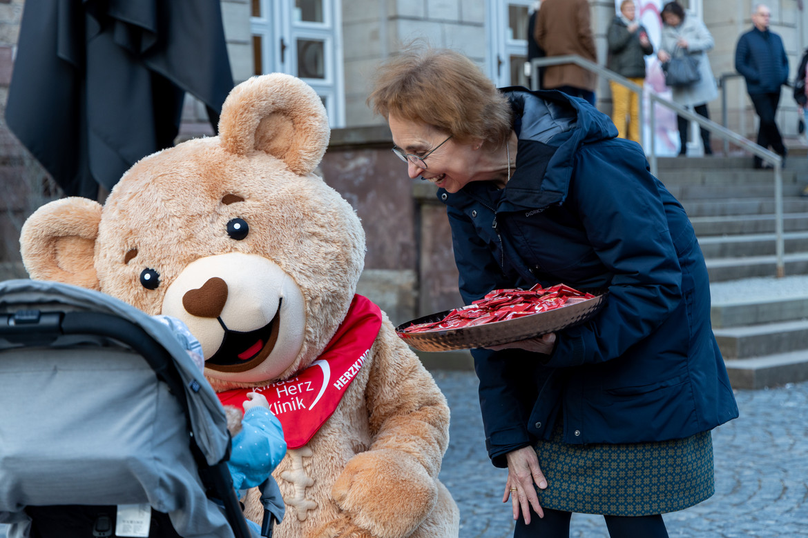 Maskottchen Pauli und Spieltherapeutin Maja Steinsiek (Kinderherzklinik der UMG) begrüßten die kleinen und großen Gäste vor dem Deutschen Theater in Göttingen.