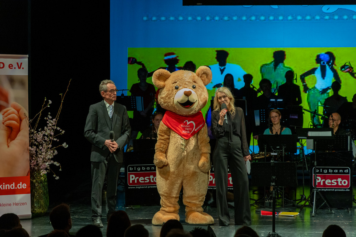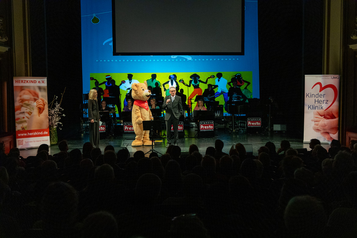 Heike Bauer (Vorsitzende des Elternvereins GEKKO, Herzkind e.V) und Prof. Dr. Thomas Paul (Direktor der Kinderherzklinik, UMG) begrüßten gemeinsam mit Maskottchen Pauli das Publikum